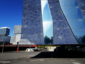 El edificio es una prisma cuya base es un triángulo equilátero de 180 metros de lado y 25 de altura. El techo del edificio contiene una pequeña piscina de escasa profundidad que se utiliza de aislante térmico. Su fachada rugosa de color azul añil se encuentra atravesada por diversas franjas de vidrio que recuerdan agua derramándose del techo. El edificio queda suspendido en el aire mediante 17 puntos de apoyo, creando así un espacio cubierto de uso público a nivel de calle. La planta se encuentra perforada por múltiples claraboyas que atraviesan el edificio en su verticalidad.