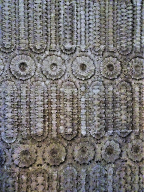 El claustro está finamente decorado con variados motivos escultóricos rodeados de abundantísima representación de flores, palmas, ramos de olivo, etc. "